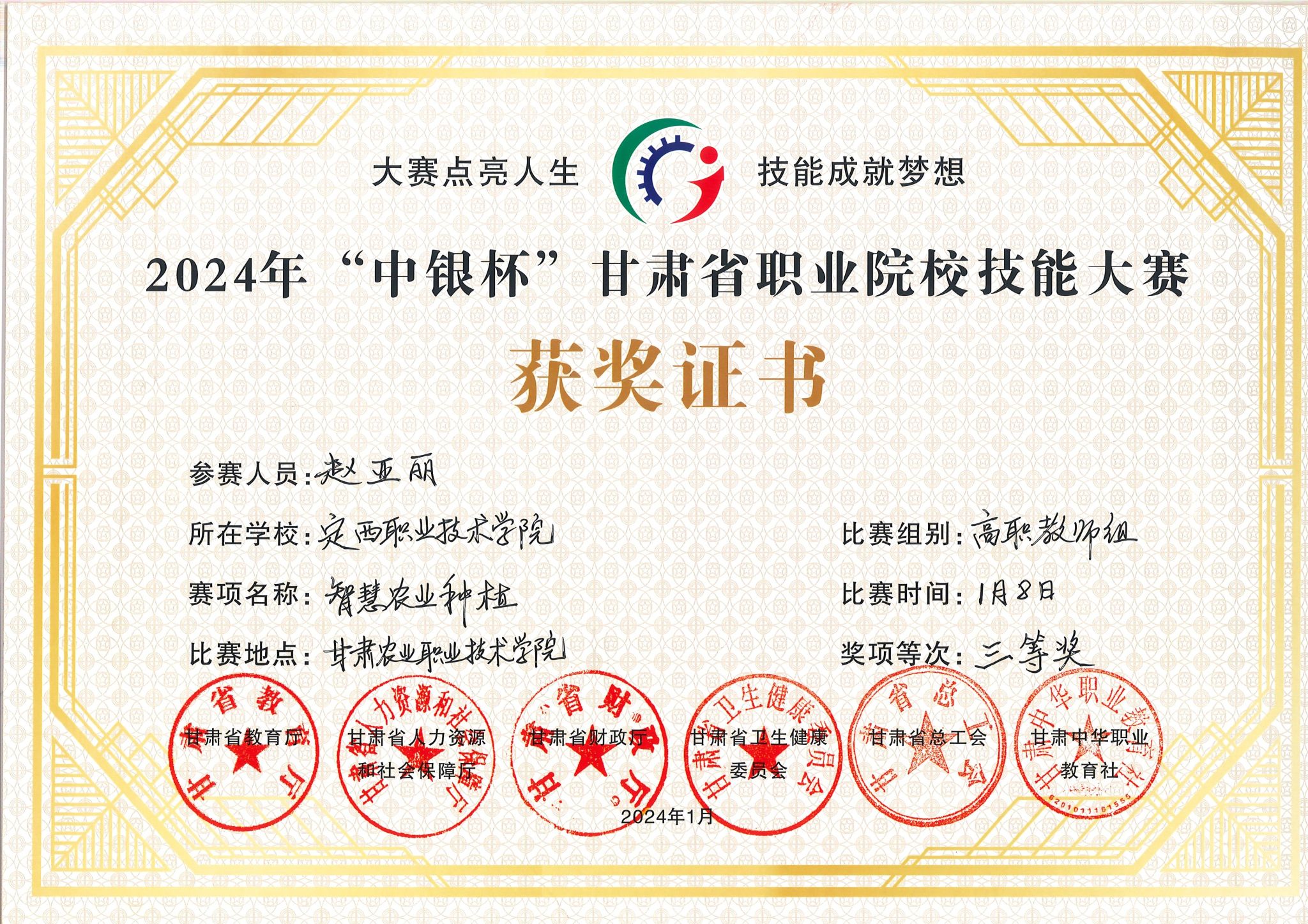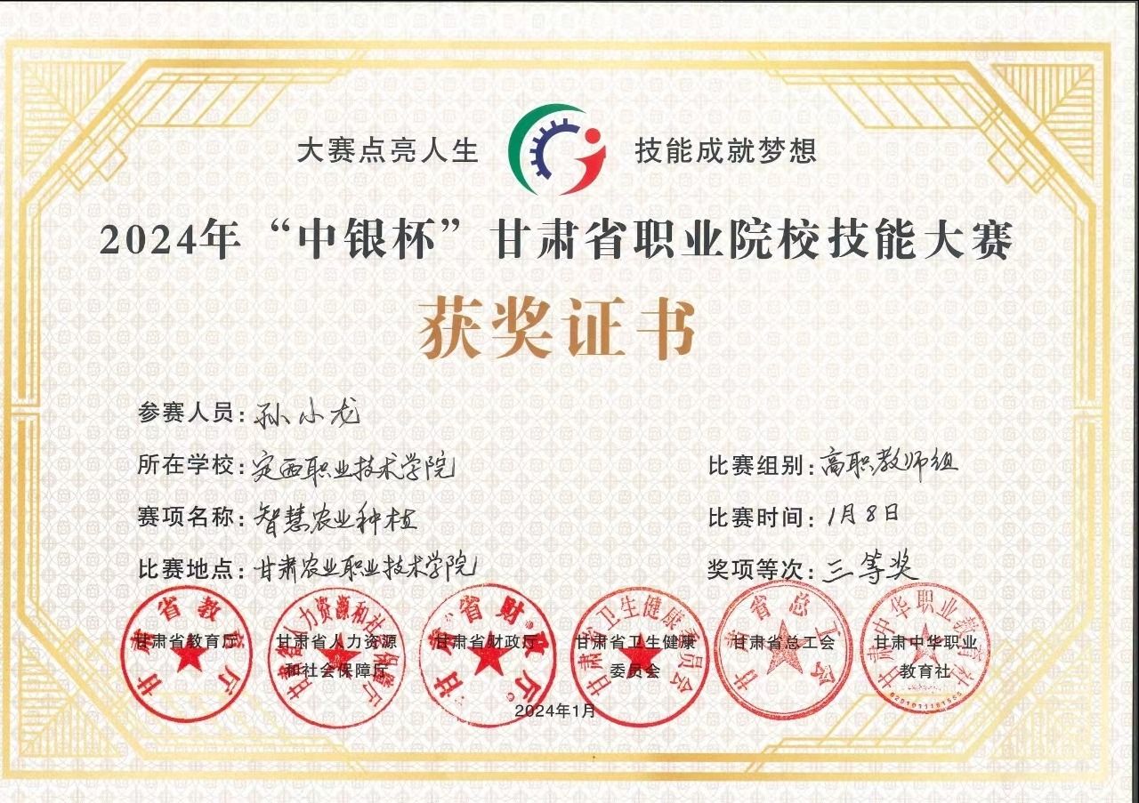 2024年“中银杯”甘肃省职业院校技能大赛“智慧农业种植”赛项获奖证书