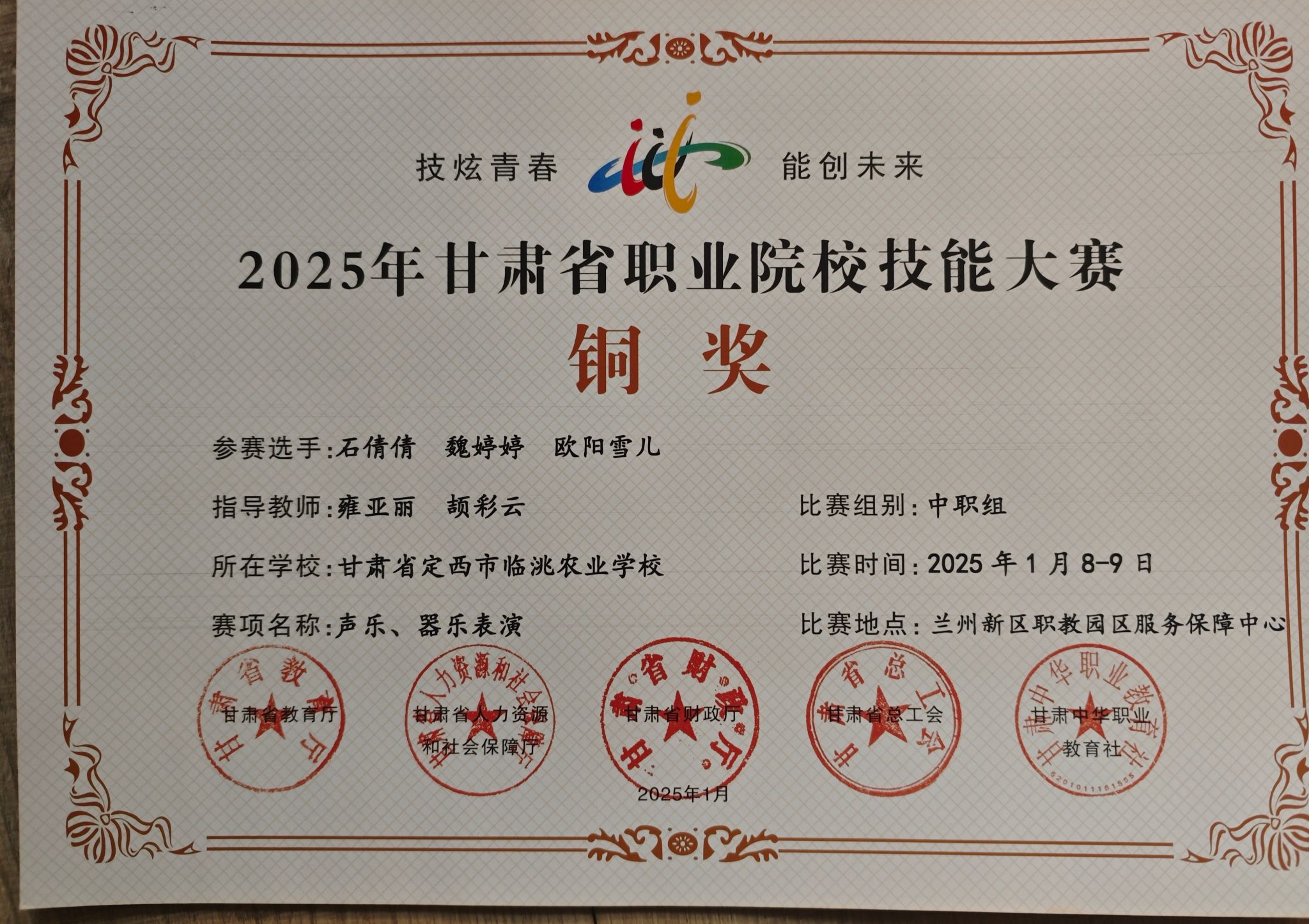 1月8日至1月9日,在2025年甘肃省职业院校技能大赛声乐、器乐表演赛场上,beat365官网学前教育学院教师雍亚丽、颉彩云辅导的学生石倩倩、魏婷婷和欧阳雪儿凭借扎实的专业功底和出色的舞台表现,从众多参赛选手中脱颖而出,斩获铜奖,为beat365官网争得了荣誉。
