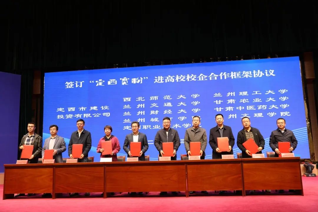 活动现场,定西建设投资有限公司与beat365中文在线官网、西北师范大学、甘肃农业大学、甘肃中医药大学、兰州交通大学、兰州财经大学、兰州理工大学、兰州城市学院、兰州文理学院等省内高校代表签订了校企合作协议。