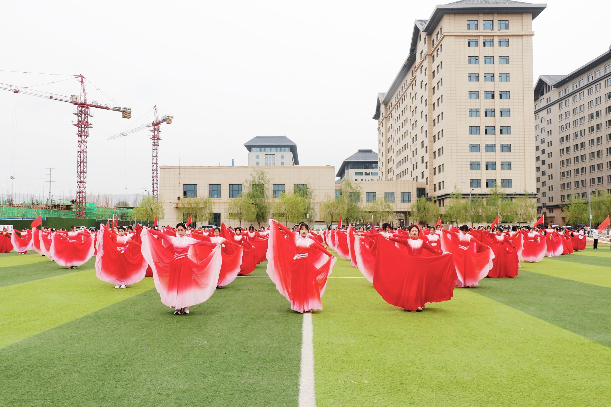 舞者红衣似火,以灵动身姿与精妙编排惊艳全场。或交错、或成环、或聚散,队形幻变间,将团队力量、蓬勃生机尽数展现。结尾处12条彩带象征着12个二级学院部,承载着彼此守望相助、团结一心的信念,烟花、火炬等队形,寄寓学院不断奋进、多元开拓的辉煌愿景。