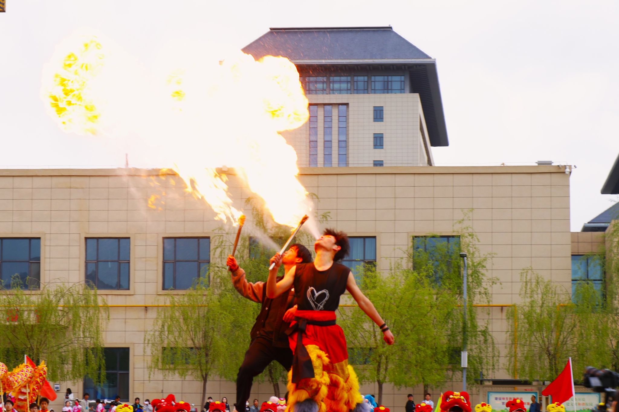 瞧,雄狮身披锦绣,目如铜铃,在队员们的默契配合下昂首摆尾、腾跃生风,尽显中华传统民俗的雄浑气势!