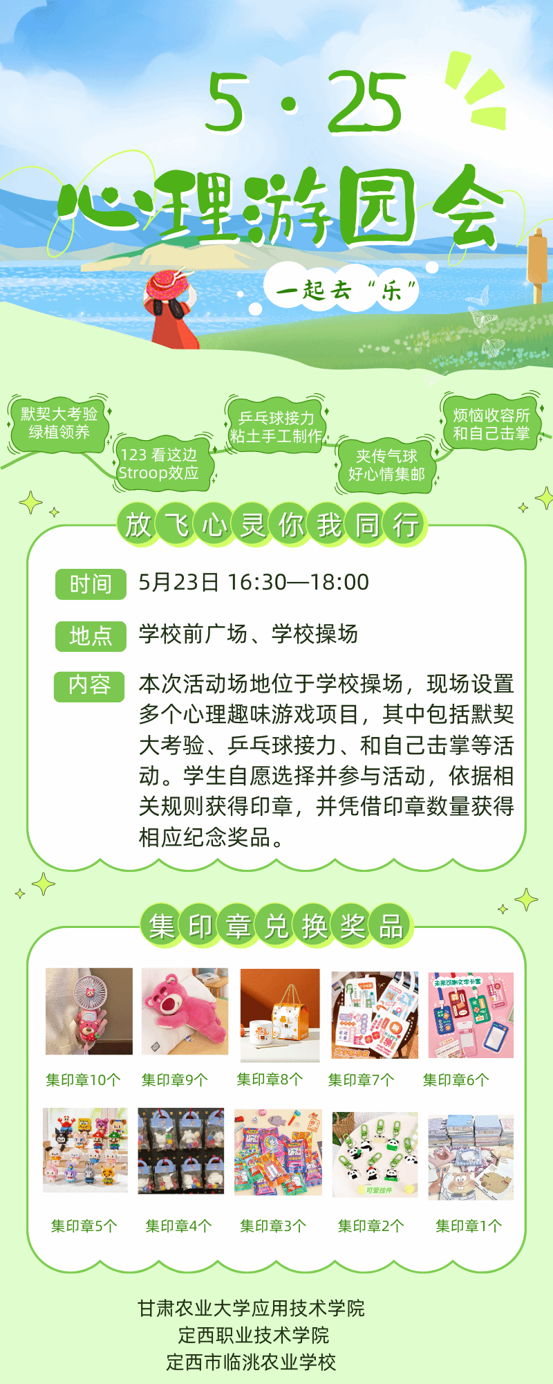 本次“放飞心灵,你我同行”心理游园会是一次探索心灵、释放压力,拉近彼此距离的奇妙“心”旅。通过形式多样的体验活动,营造了融洽、积极进取的心理健康教育氛围,丰富了同学们的课余生活,增进了学生之间的互动与了解,宣传掌握了心理健康知识,养成健康、乐观、积极的学习和生活态度。在体验中,收获成功的喜悦,也增进了彼此之间的友谊,学会了自我关爱。愿同学们带着开心游园的心情,拥抱未来,绽放青春的光芒。