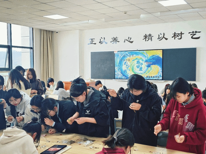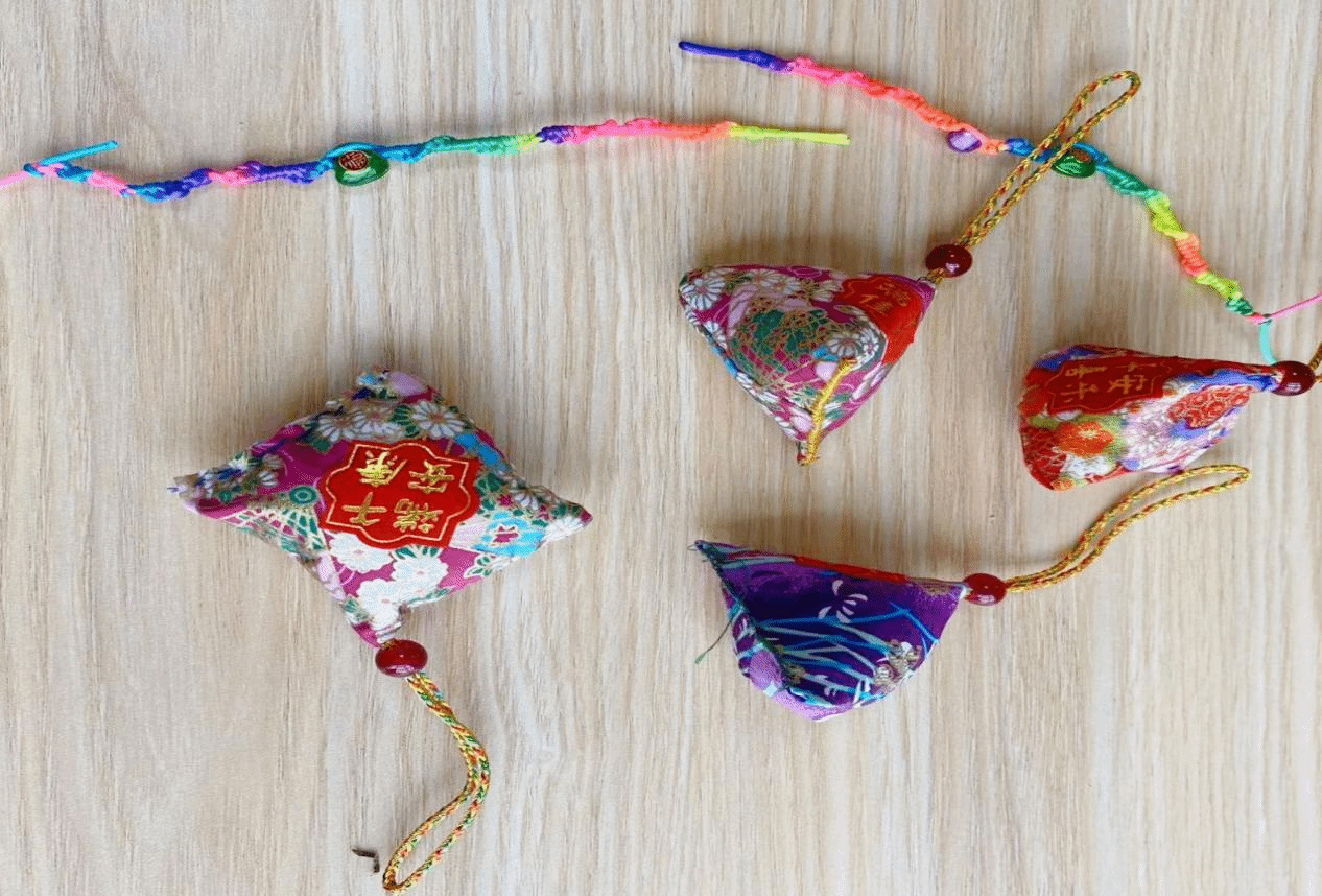 《离骚》记载:“扈江离与辟芷兮,纫秋兰以为佩”,因此说来古人在端午佩戴香囊是以纪念屈原。《神农百草经百种录》亦提及:“香者气之正,正气盛,则自能除邪避讳也。”古人在五毒月“戴个香草袋,不怕五虫害”,(五月初五是毒日,五日的中午又是毒时,端午节又叫五月端)。同学们用准备好的花布和针线,按视频教学缝制起各色香囊,从最开始的穿针引线到一针一线将香囊缝合,将艾草填入其中,并学会如何将香囊收紧,制作完成后纷纷佩戴香囊以驱邪祛瘟、襟头点缀。