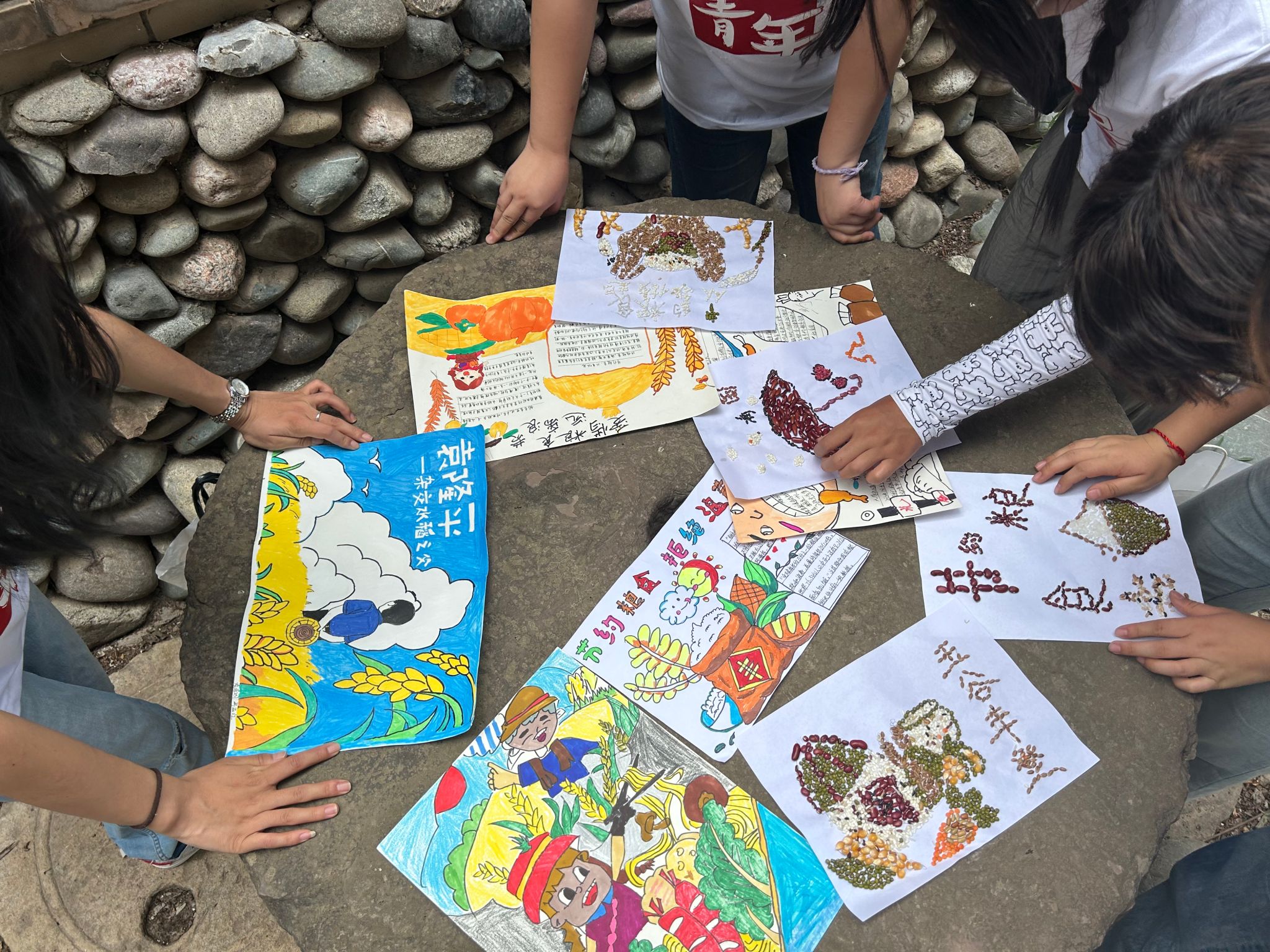 此外,同学们还赴双联村绘画手抄报和粘贴画,展现粮食从种植、收割到加工、使用的全过程,希望通过艺术的形式体验粮食的珍贵性和重要性。绘画现场,同学们充分发挥想象力和创造力,绘画内容丰富多彩,直观生动。在这一创作过程中,同学们相互学习、交流心得不仅增进了彼此之间的友谊,也提高了对粮食安全的认识和重视程度。